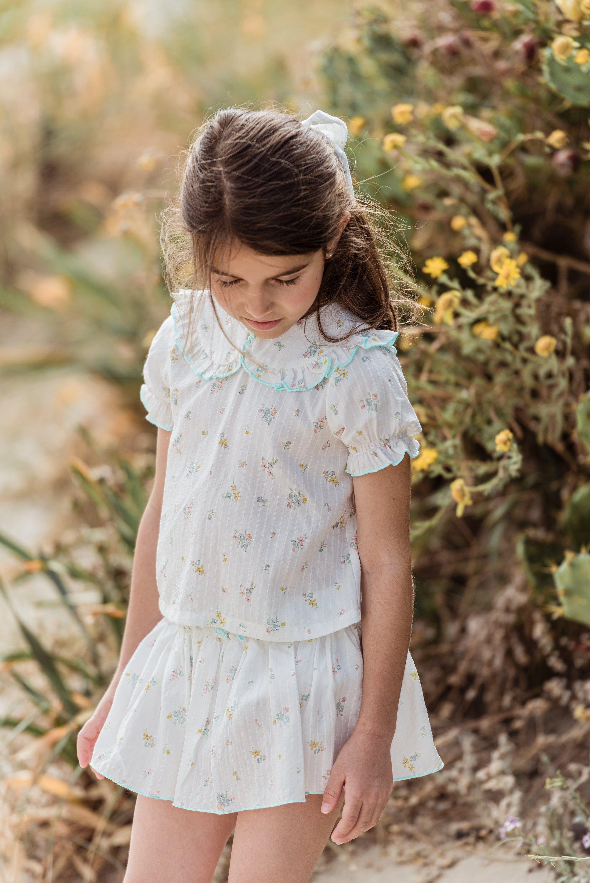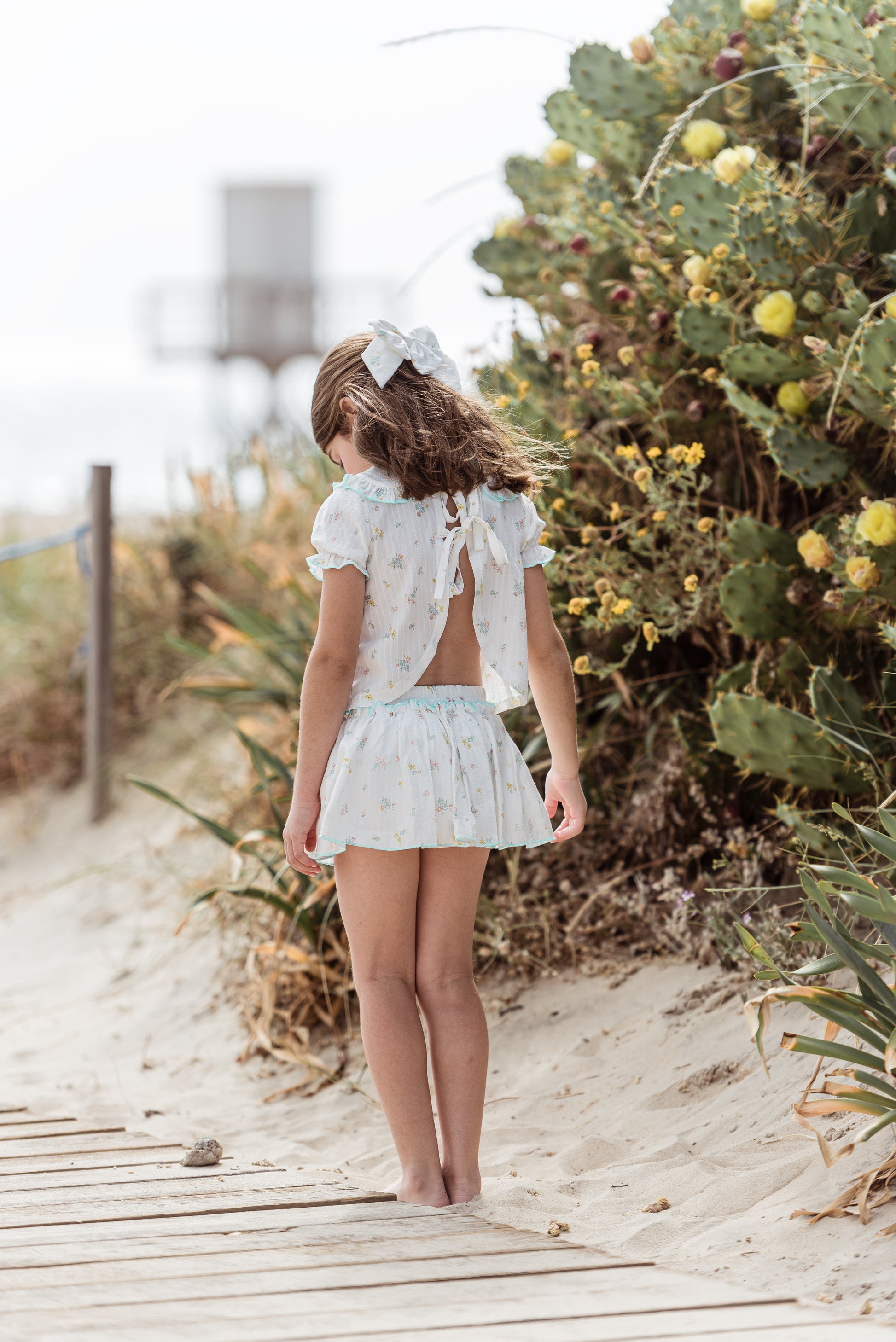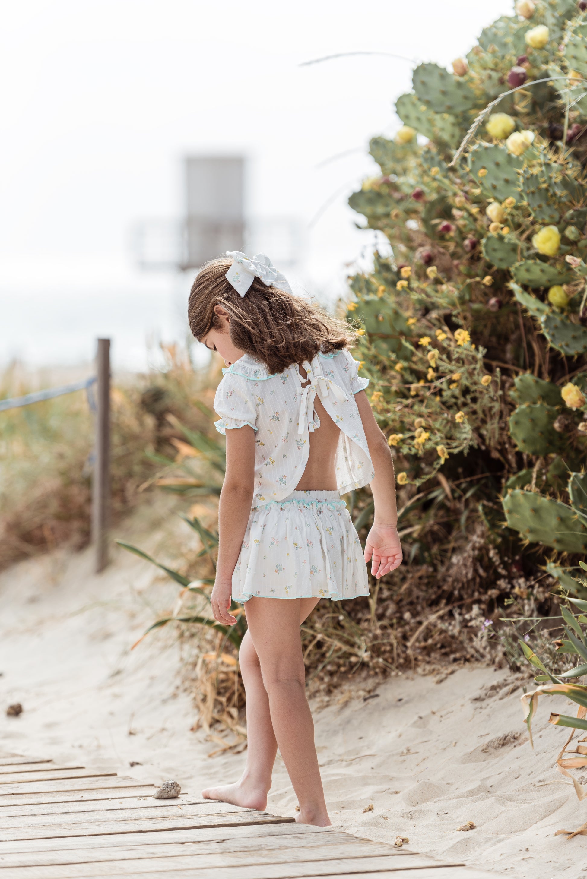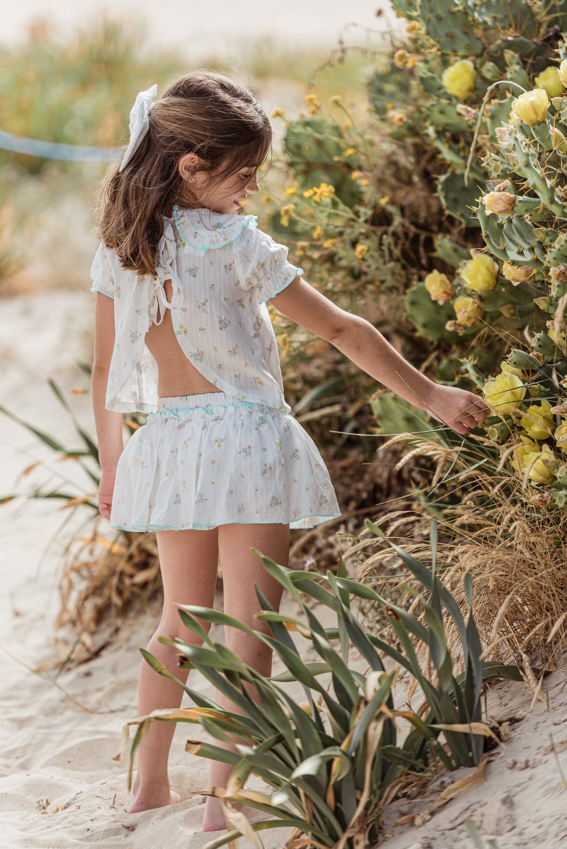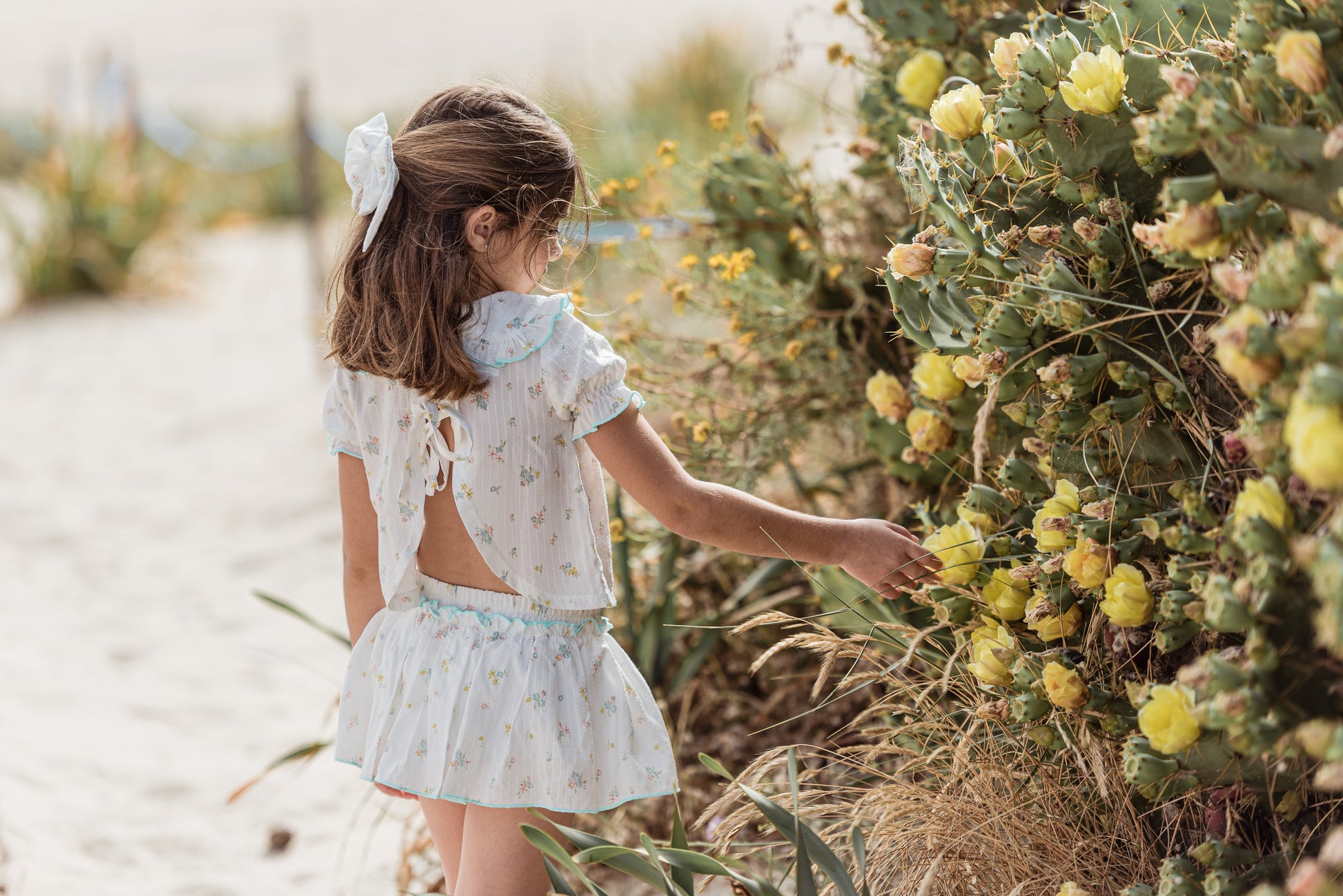 Flor de Sal es un tejido estampado sobre una base de algodón 100% con un bordado en el mismo tejido y un estampado floral en tonos muy suaves y veraniego .