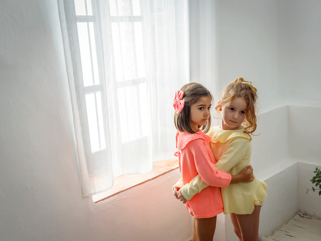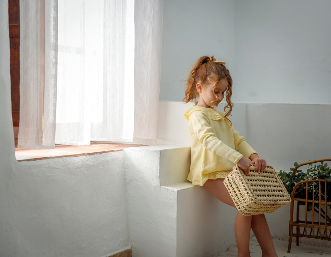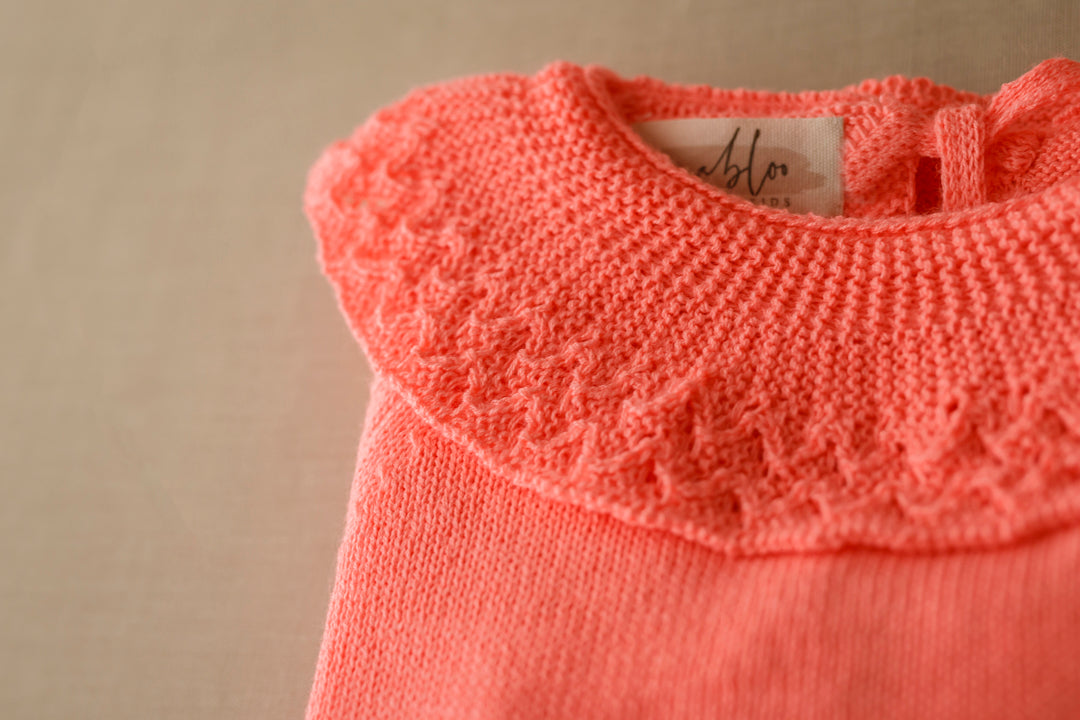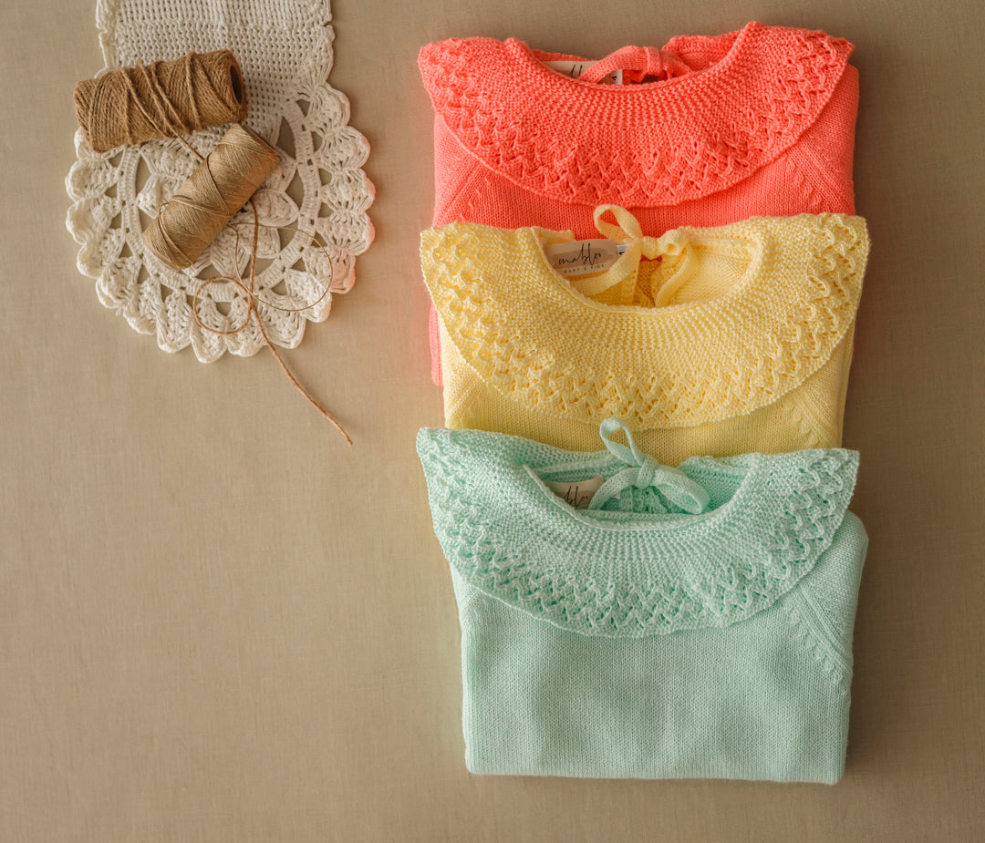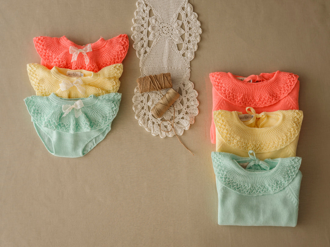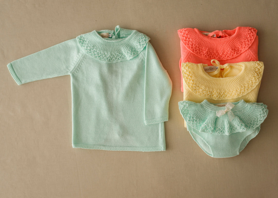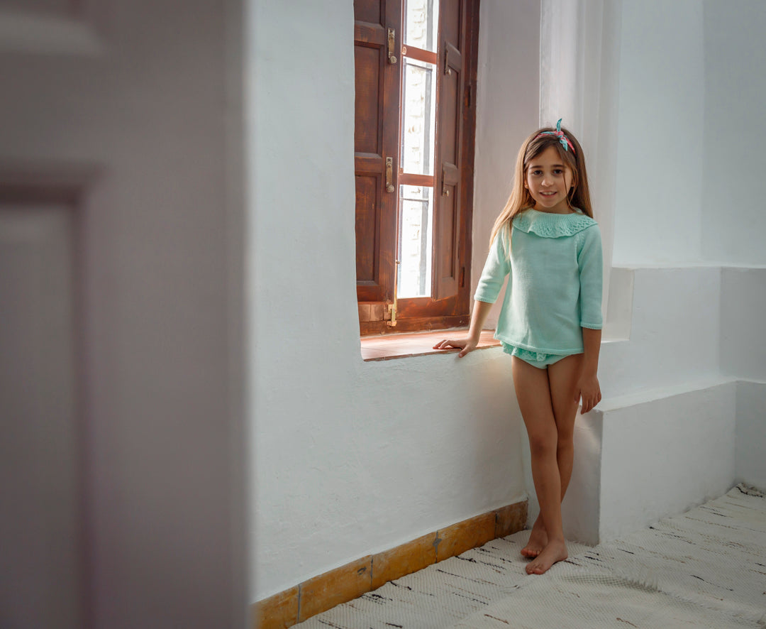 *Jersey cuello volante brocado de mangas francesas , abierto por atrás. Se cierra con dos lacitos