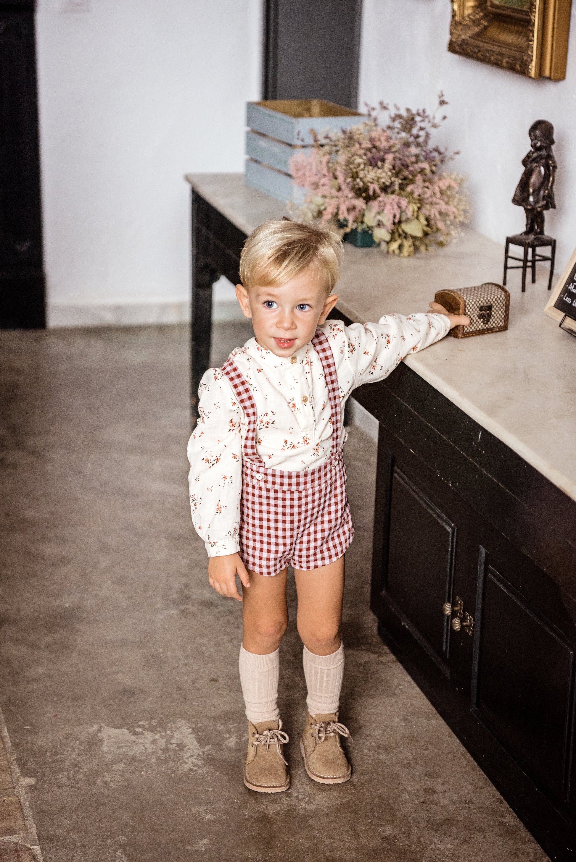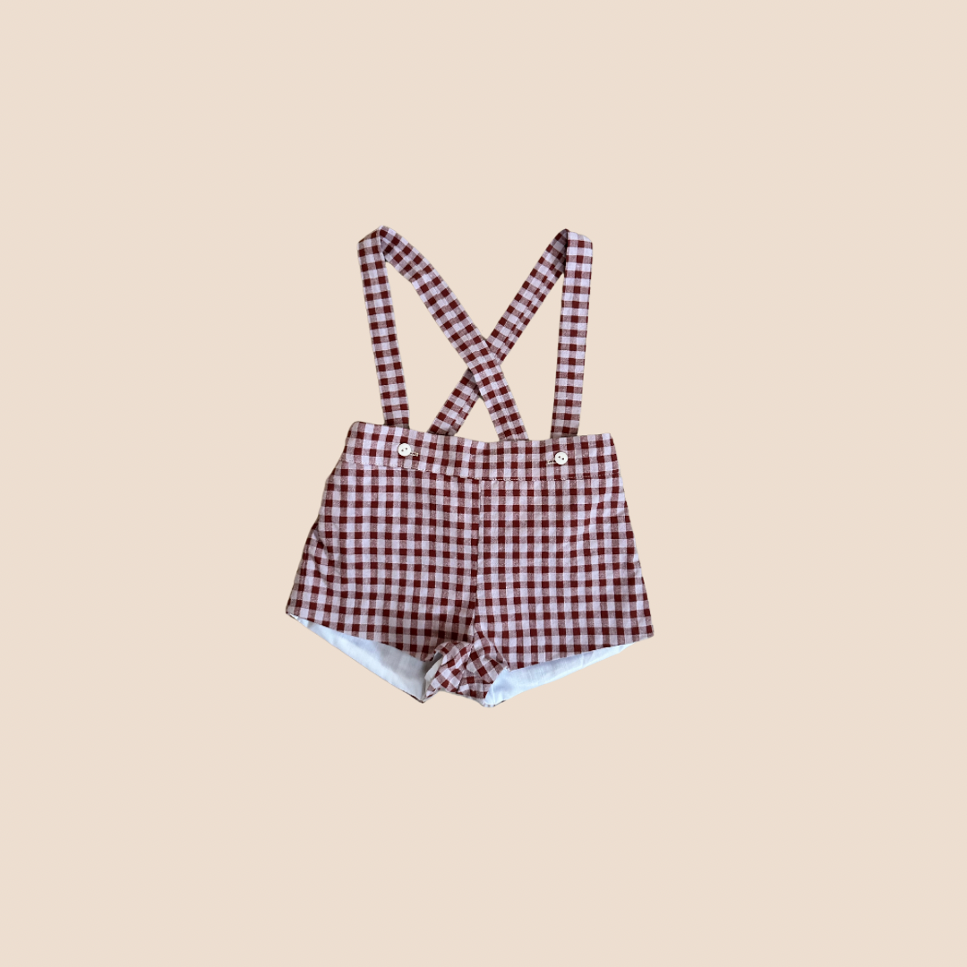 Naxo en tartán vichy Cherry . Forradito por el interior , ajustable en cintura con gomitas y aperturas a ambos lados con botoncito para que se ajuste mejor a su cinturita . Los tirantes son ajustables con botón