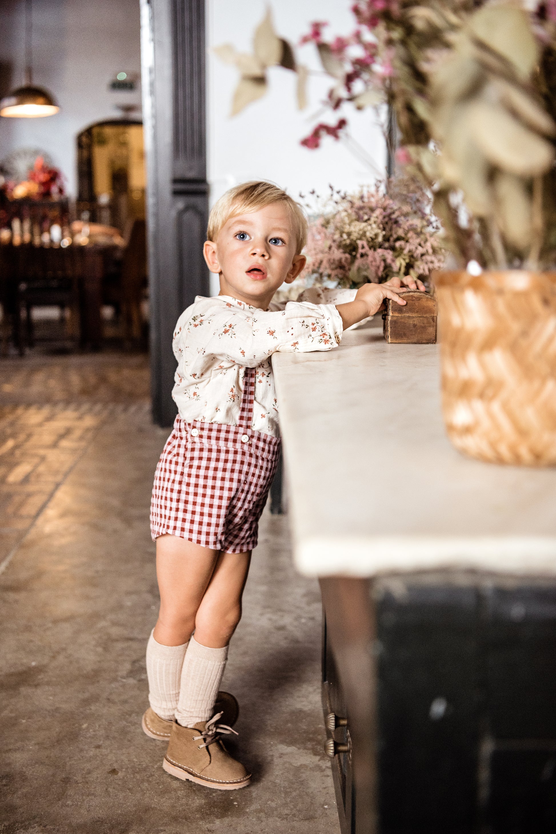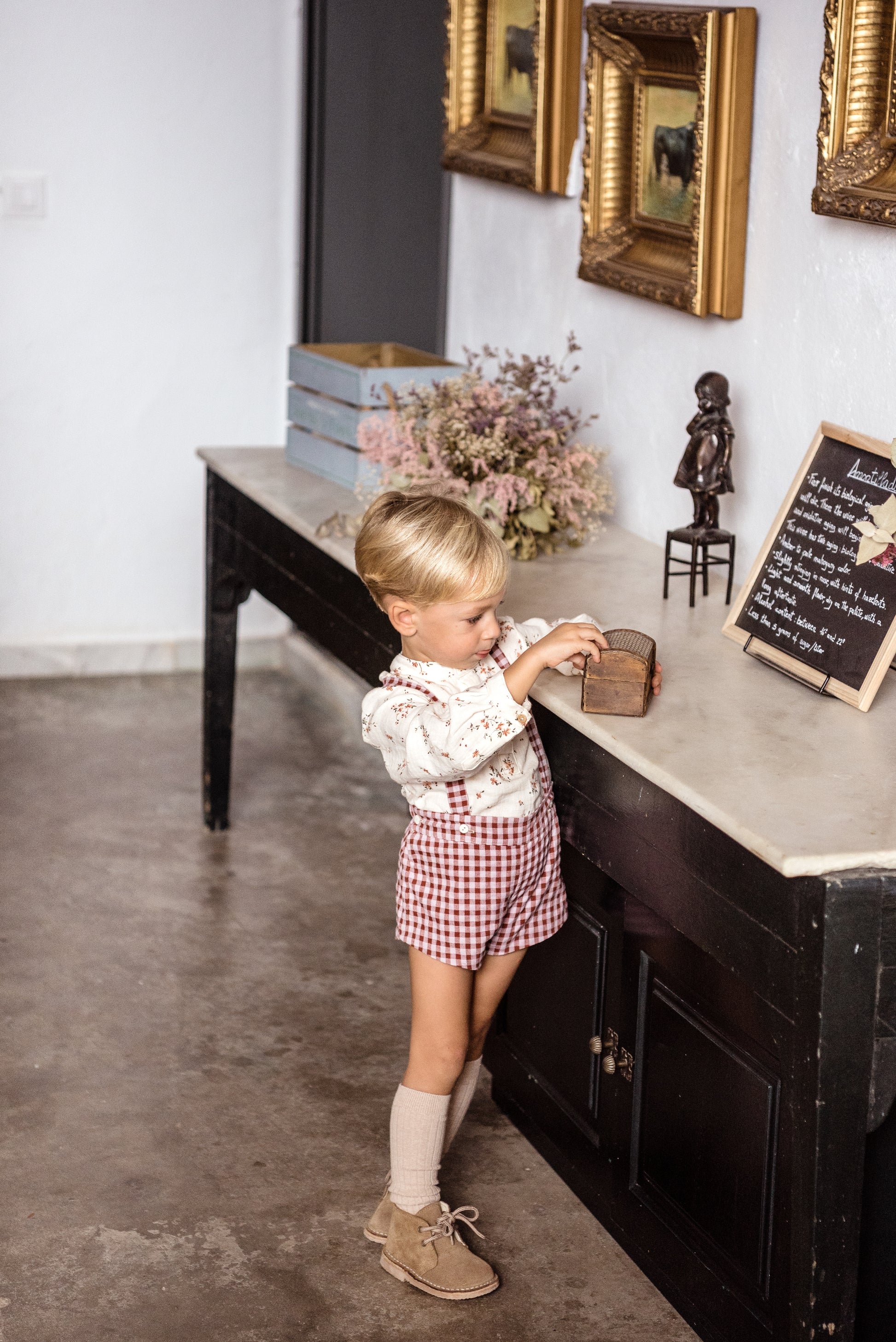 Polera Blosson , un tejido en bambula con una flor especial en tonos empolvados . Abotonada en puños y por la zona delantera con cuello mao .
